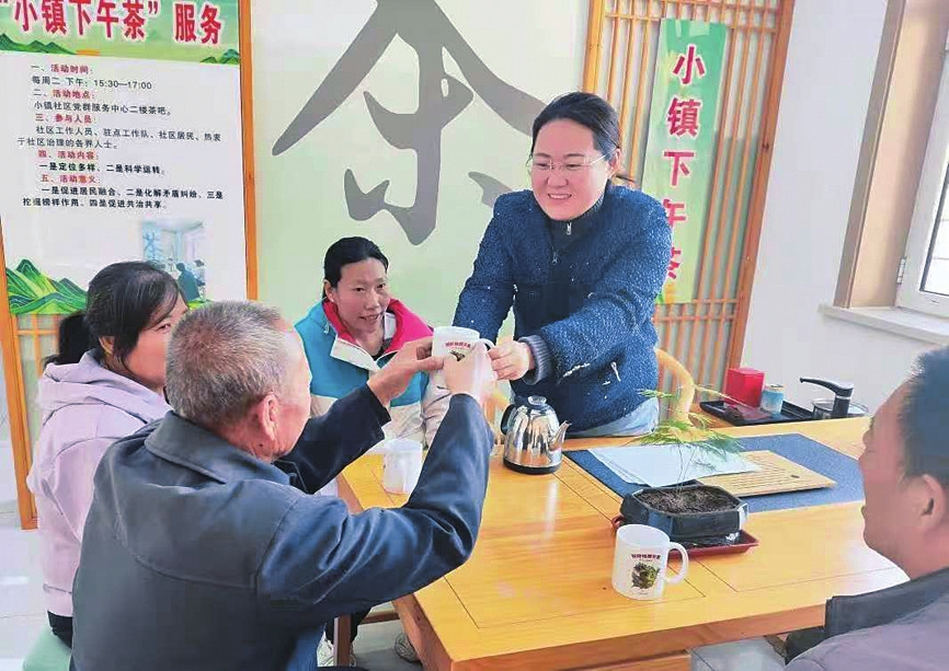 图④:石楼县开展“小镇下午茶”活动,报到党员、网格员、物业公司和居民共同参与、解决纠纷。