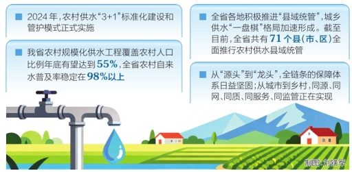 目前,全省各地正用实实在在的举措,将分散在一村一乡的小型供水工程串联成保障程度更高的县域“大水网”。据了解,我省农村规模化供水工程覆盖农村人口比例年底有望达到55%,全省农村自来水普及率稳定在98%以上。