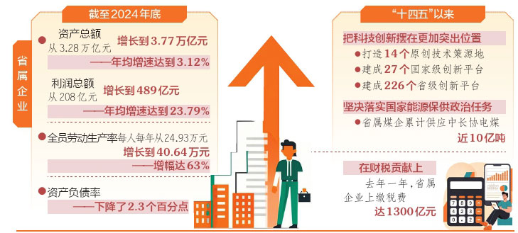 截至2024年底,省属企业资产总额从3.28万亿元增长到3.77万亿元,利润总额从208亿元增长到489亿元,年均增速分别达到3.12%和23.79%。在全国省级监管企业中,我省国企的资产总额、营业收入、利润总额等指标也稳居前列。省属企业的全员劳动生产率每人每年从24.93万元增长到40.64万元,增幅达63%;资产负债率下降了2.3个百分点。去年以来,煤价大幅回调,煤炭企业持续承压,但我省国企的非煤企业利润依然实现了两位数增长,达到了11%,国资国企的发展韧性和抗风险能力正在稳步增强。