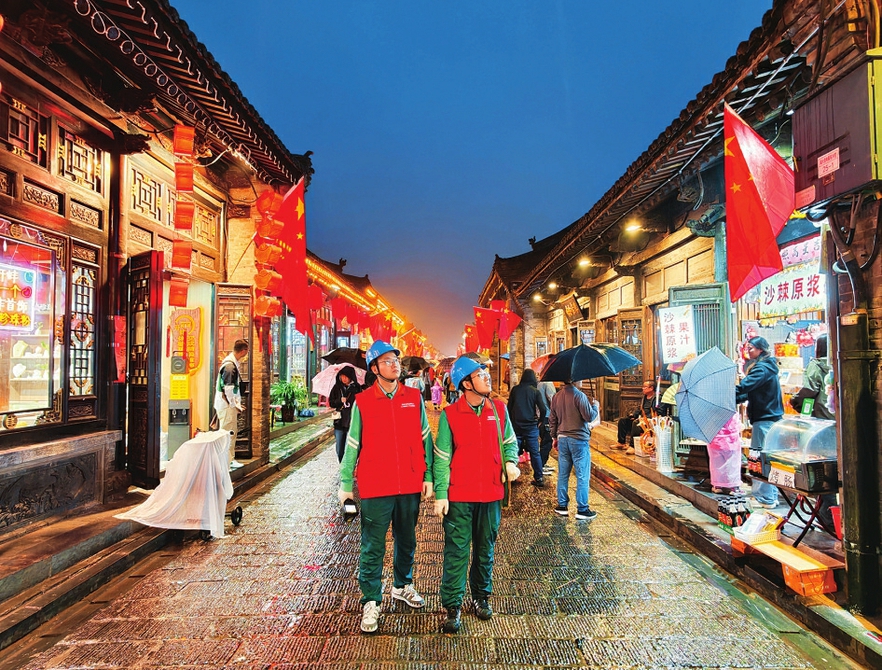 国网平遥县供电公司党员服务队与青年突击队冒雨开展特巡,排查用电隐患。师文慧摄