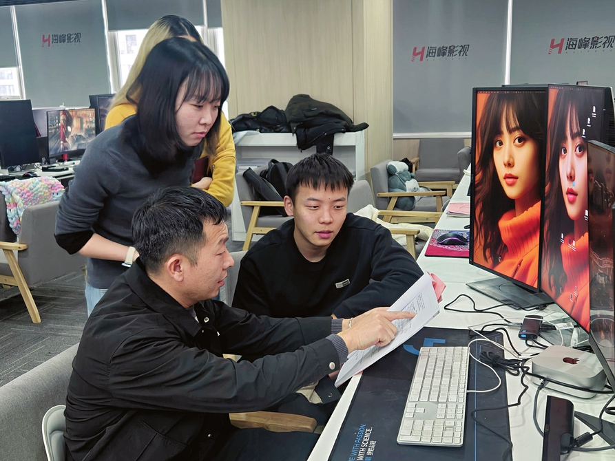 海峰影视剧组工作人员在研讨剧本。