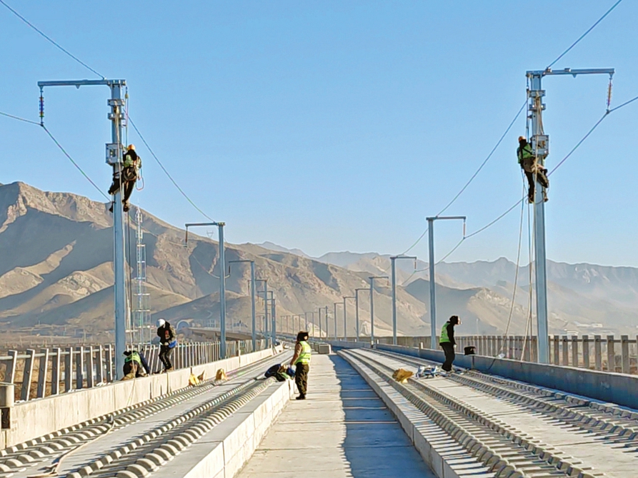 忻州建设者在雄忻高铁忻州段同河特大桥上进行接触网施工。本报记者李春泽摄